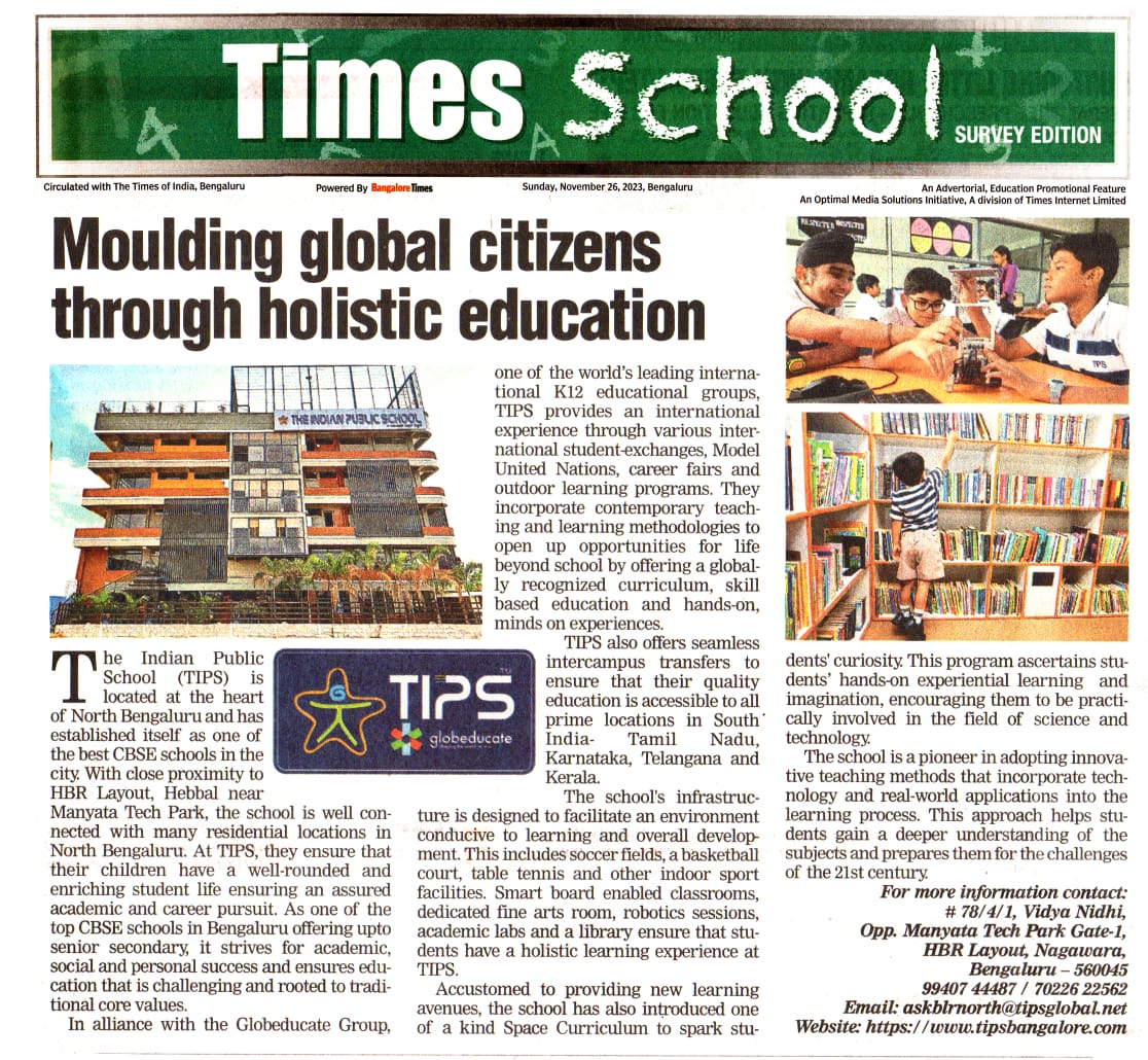 We are proud to announce that TIPS Bengaluru is again being recognized as the top emerging school by Times of India for the year 2023. Such acknowledgments are a testament to the school’s commitment to academic excellence and overall development of its students. It reflects positively on the dedication of the school’s staff, the quality of education provided, and the positive impact on the students’ growth.